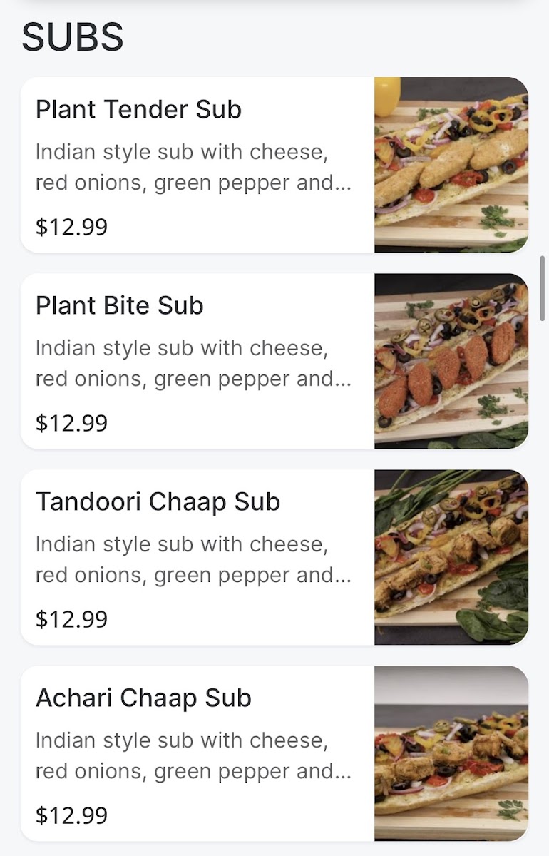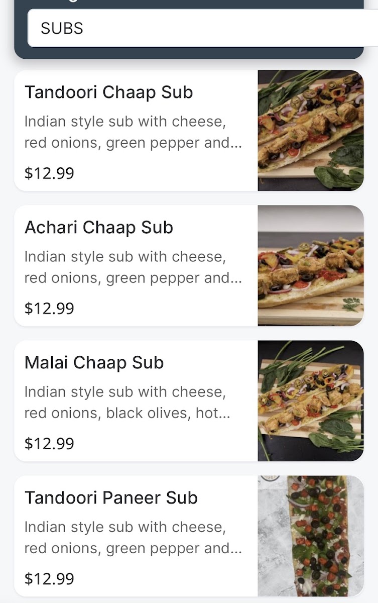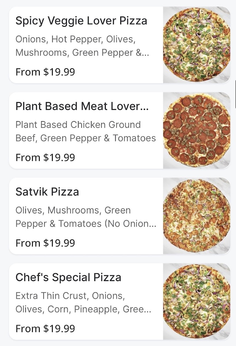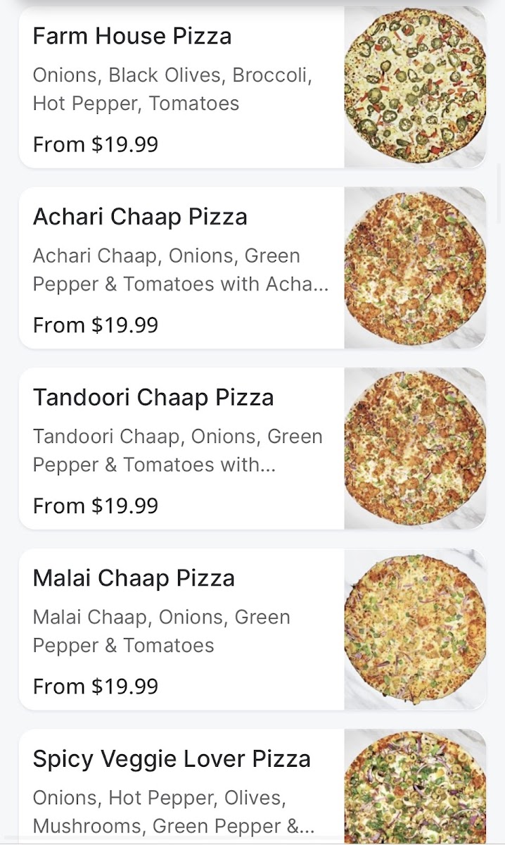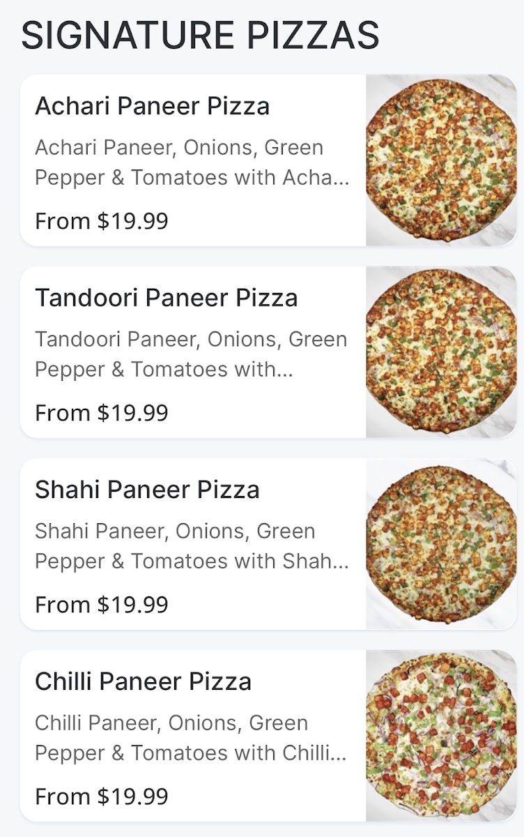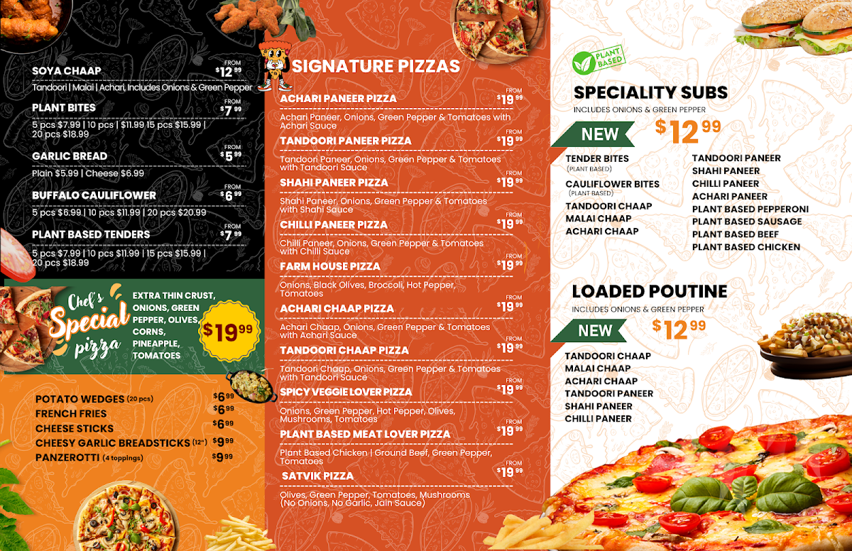 The restaurant showcases a vibrant menu that invites you to Create Your Own Pizza for just CA$13.99. This means you can customize your pie with an impressive selection of toppings to fulfill your every craving, from savory cheeses to fresh veggies. If you’re in the mood for something unique, don’t miss the opportunity to try their delectable Soya Chaap Malai, Soya Chaap Tandoori, or the Achaari Paneer Pizza, all priced at CA$12.99. These options cater to both meat-lovers and vegetarians alike, making every visit an adventure in taste.